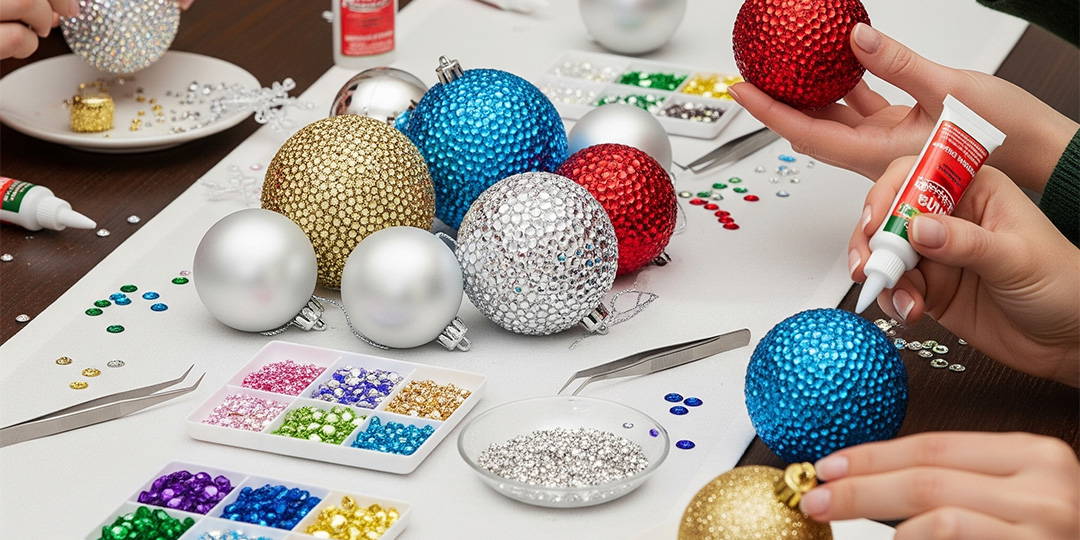 - Sparkling Ornaments: Pick up clear baubles or wooden shapes and let guests cover them in rhinestones for tree-ready bling.