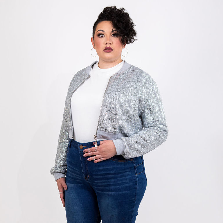 Strass Rhinestone Cropped Bomber Jacket - Silver - Extra Large