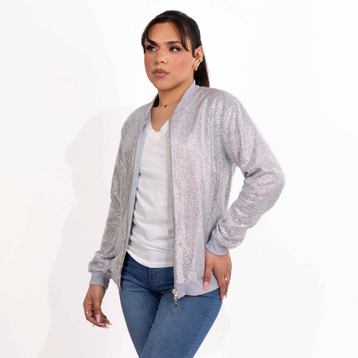 Description / Strass Rhinestone Bomber Jacket - Silver - Medium