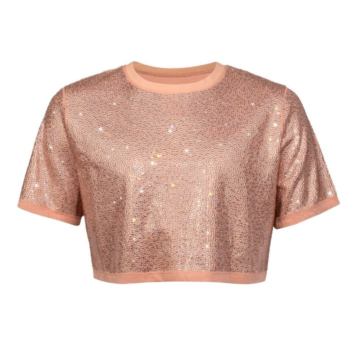 Pink crop top with short sleeves covered in shiny rhinestones and a smooth solid pink neckline and hem. Pink crop top with short sleeves covered in shiny rhinestones and a smooth solid pink neckline and hem.
